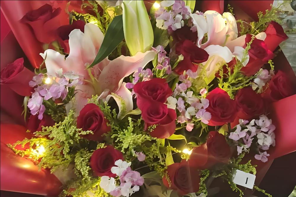 百合:白色多头百合是镇店之宝,和玫瑰组CP,寓意“百年好合”,结婚、生日都抢着订。